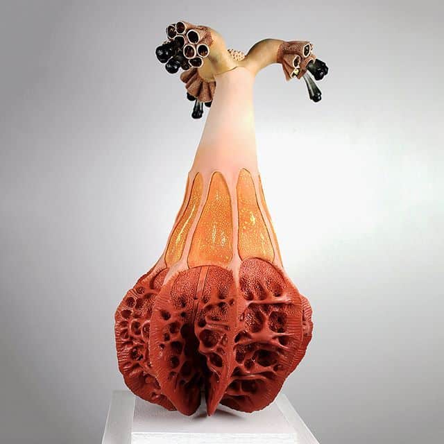 Sara Catapano‘s ceramic figurines seem as absorbing, nevertheless disconcerting biomorphic forms that defy their medium. Even though there are otherworldly attributes to these pieces, the artist’s observations here on Earth play a direct role in the creation of her work. She says that “these bio-expressive forms are, in some ways, reactions and responses to social and personal experiences.”